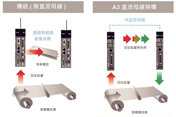 多臺驅(qū)動器使用共直流母線功能,節(jié)省煞車電阻使用數(shù)量,降低成本