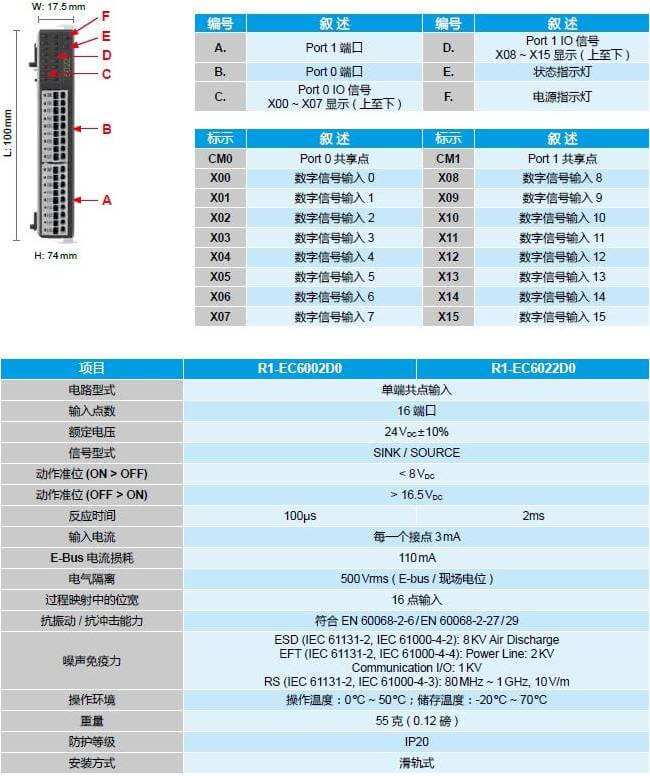 EtherCAT 16 通道數(shù)字輸入擴展模塊 - R1-EC60XXD0