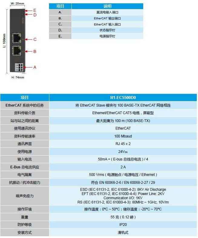 EtherCAT 集合式 E-BUS 電源模塊 - R1-EC5500D0 E-BUS 電源模塊支持 EtherCAT 的標準通訊協(xié)議,可連接數字輸入輸出、模擬輸入輸出與脈沖輸入輸出等擴展模塊